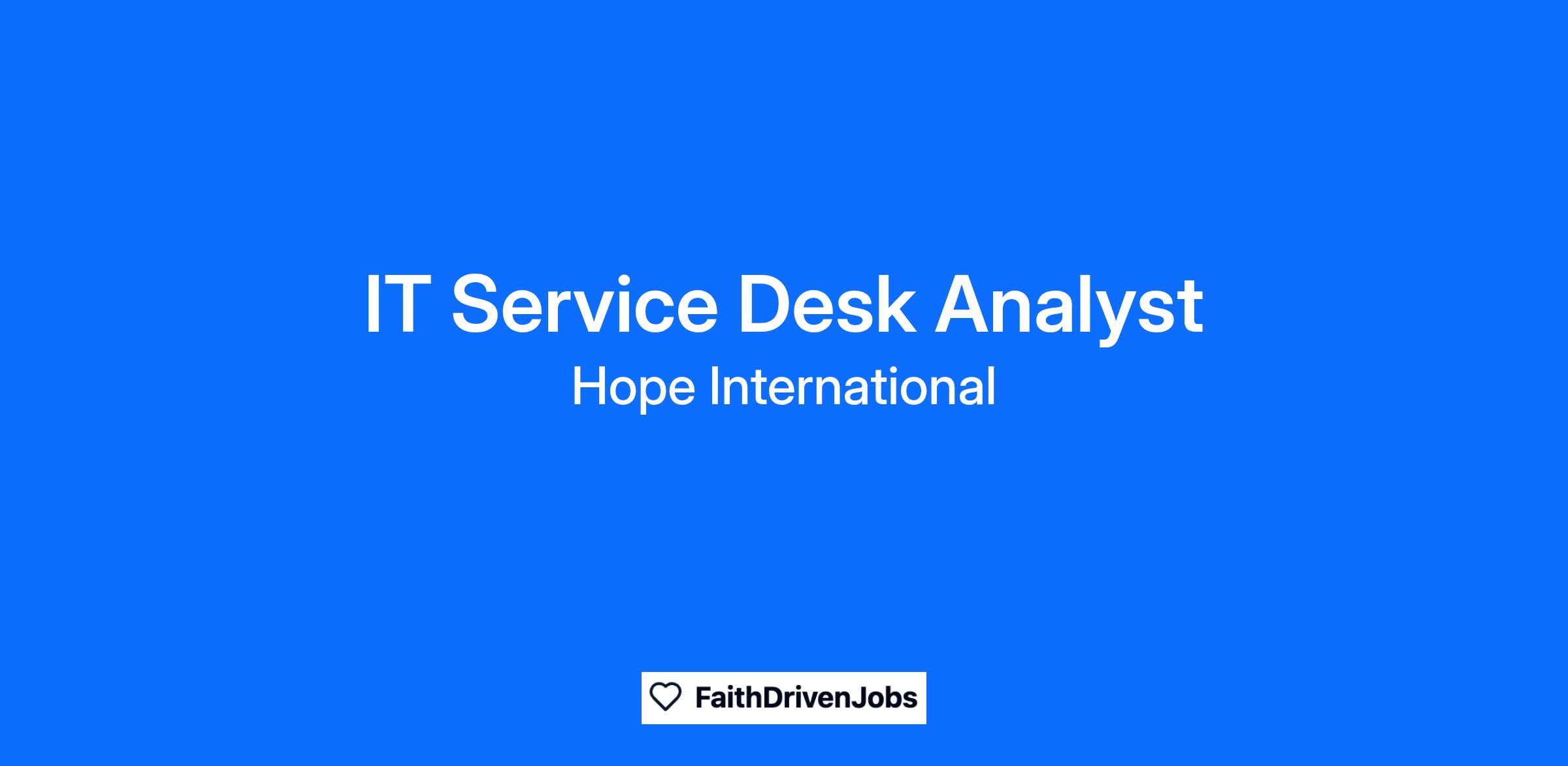 The IT service desk analyst is responsible to ensure consistent operation of HOPE’s technology resources so that end users can accomplish business tasks. This includes managing technology assets (both hardware and software), administration of user accounts, addressing service desk requests, training staff members, and supporting videoconferencing and event technology. Completing these important support activities directly relates to HOPE International’s ability to accomplish its mission and serve our clients around the globe.